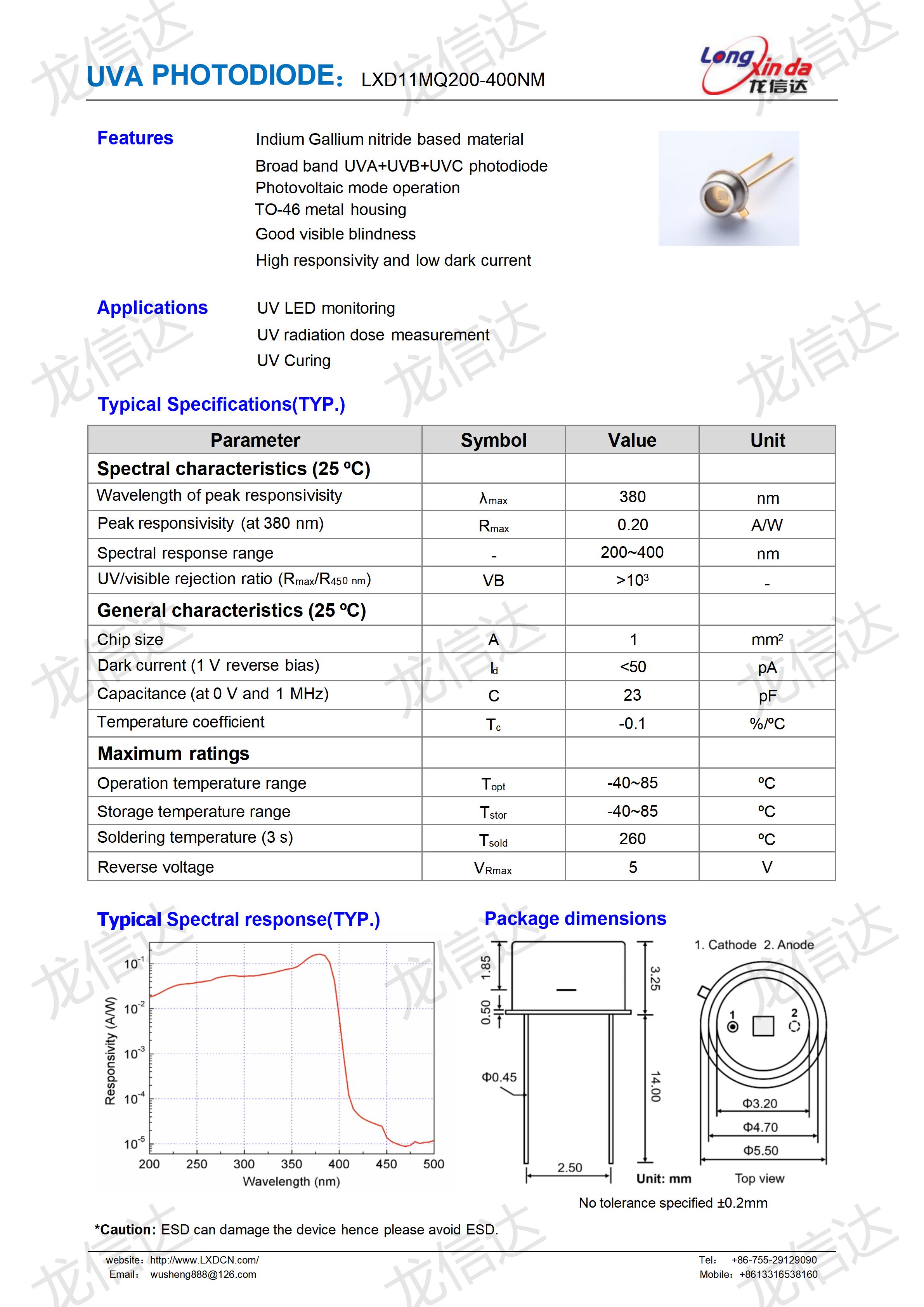 TO46封装氮化镓类UV光电管200-420nm系列